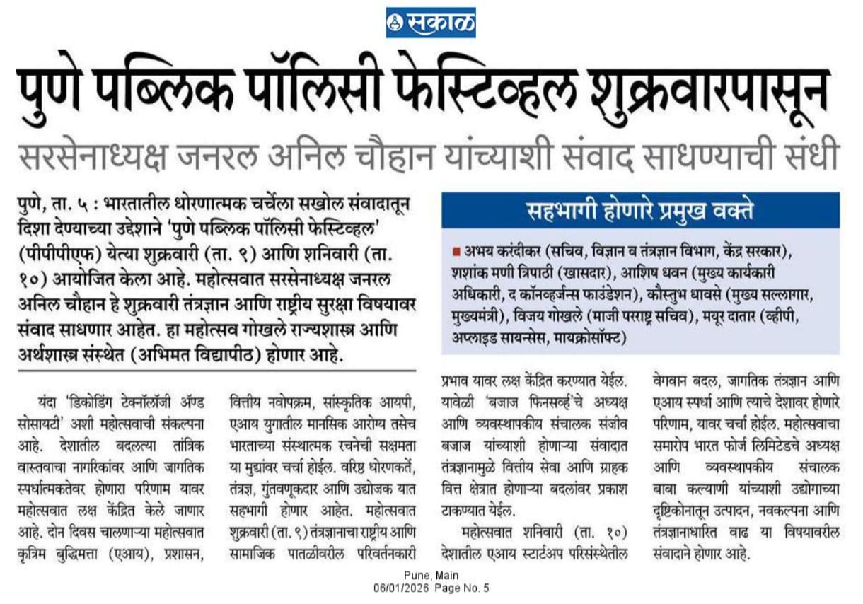 पुणे पब्लिक पॉलिसी फेस्टिवल शुक्रवारपासून: सरसेनाध्यक्ष जनरल अनिल चौहान यांच्याशी संवाद साधण्याची संधी